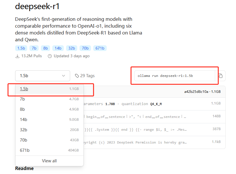 复制模型安装命令:ollama run deepseek-r1:1.5b。