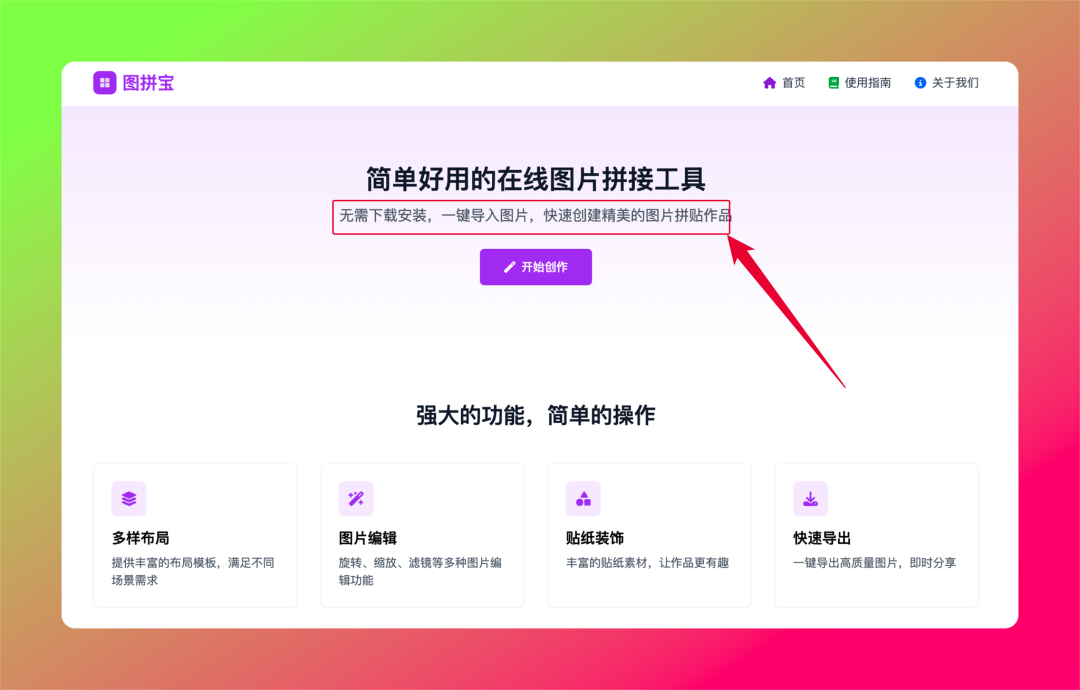 简单好用的在线图片拼接工具,无需下载安装,一键导入图片,快速创建精美的图片拼贴作品