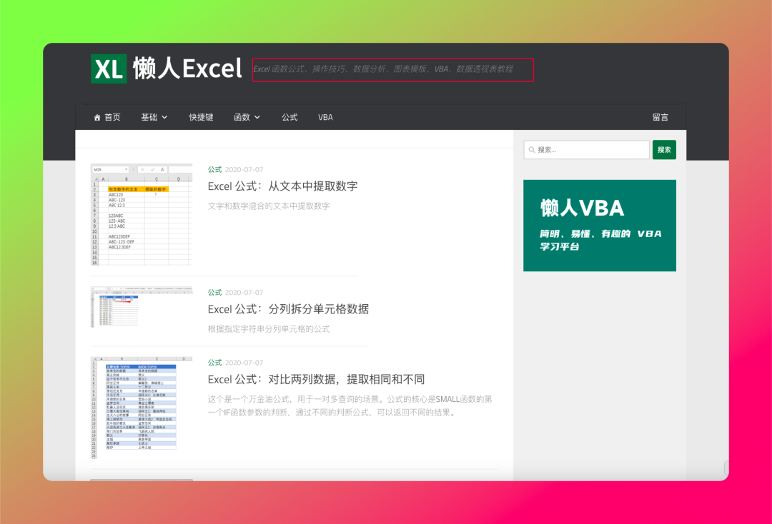 Excel 教程网站,职场人士必备,免费无广告。包含了各种 Excel 函数公式、操作技巧、数据分析、图表模板、VBA、数据透视表教程。