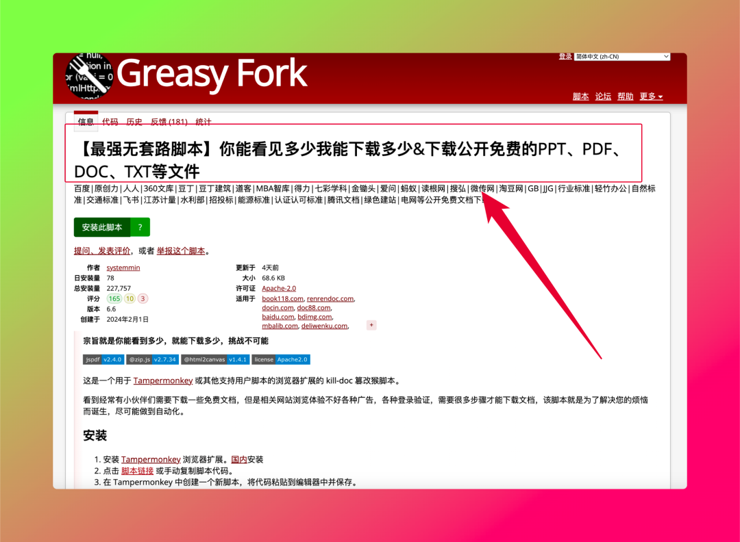 一个非常强的油猴脚本。找文档很多网站都不能直接下载,需要会员或者登录反正很麻烦。这个脚本省略这些流程,方便下载免费文档。号称公开免费的文档,能看到多少,就能下载多少。