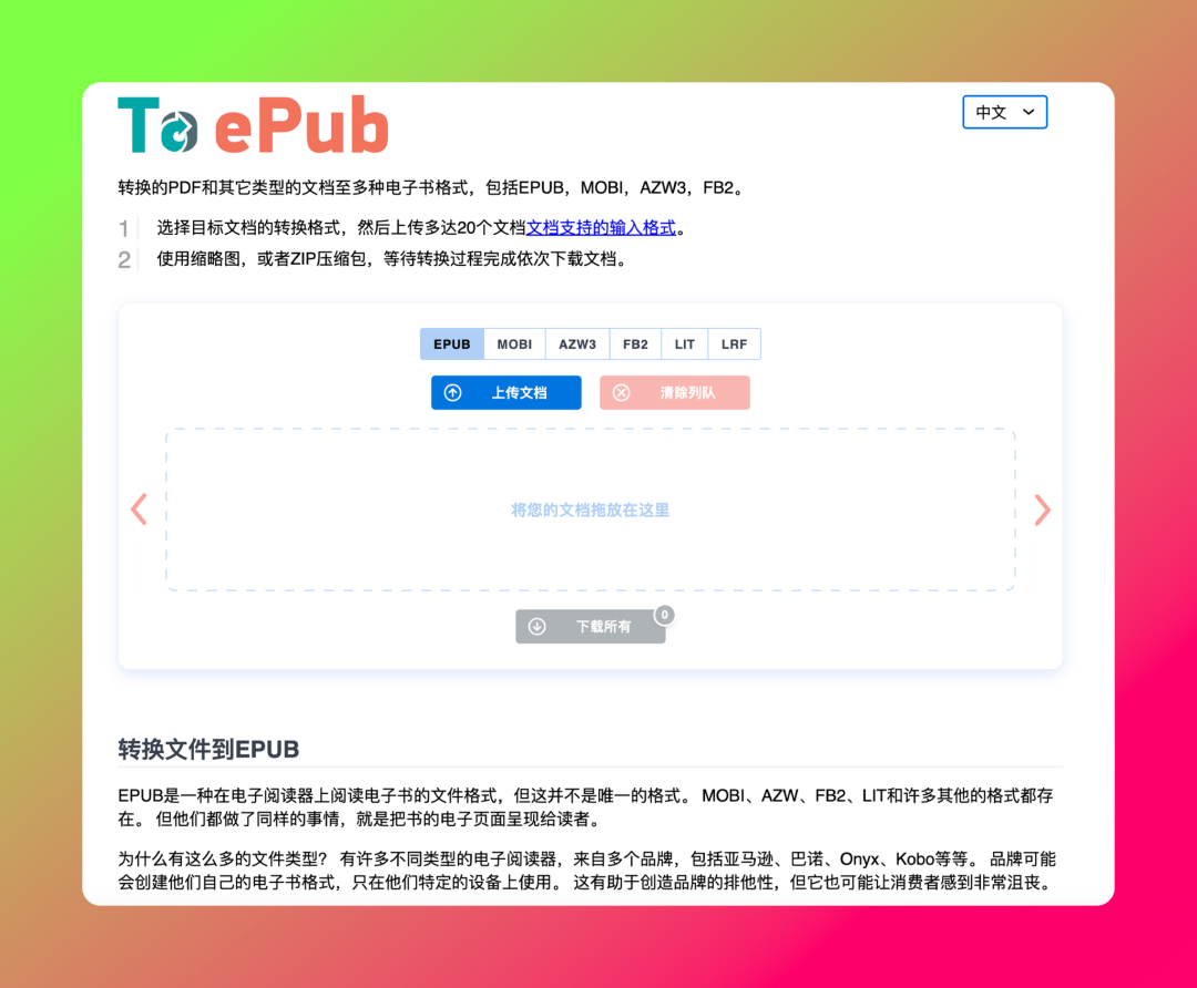 一个免费的电子书格式转换工具。支持将 36 种文件格式的电子书,转换为 EPUB、MOBI、AZW3、FB2、LIT、LRF 格式。打开即用,无需登录,完全免费,可以一次上传 20 本电子书,非常给力。