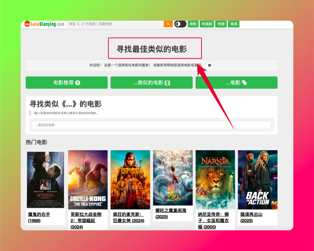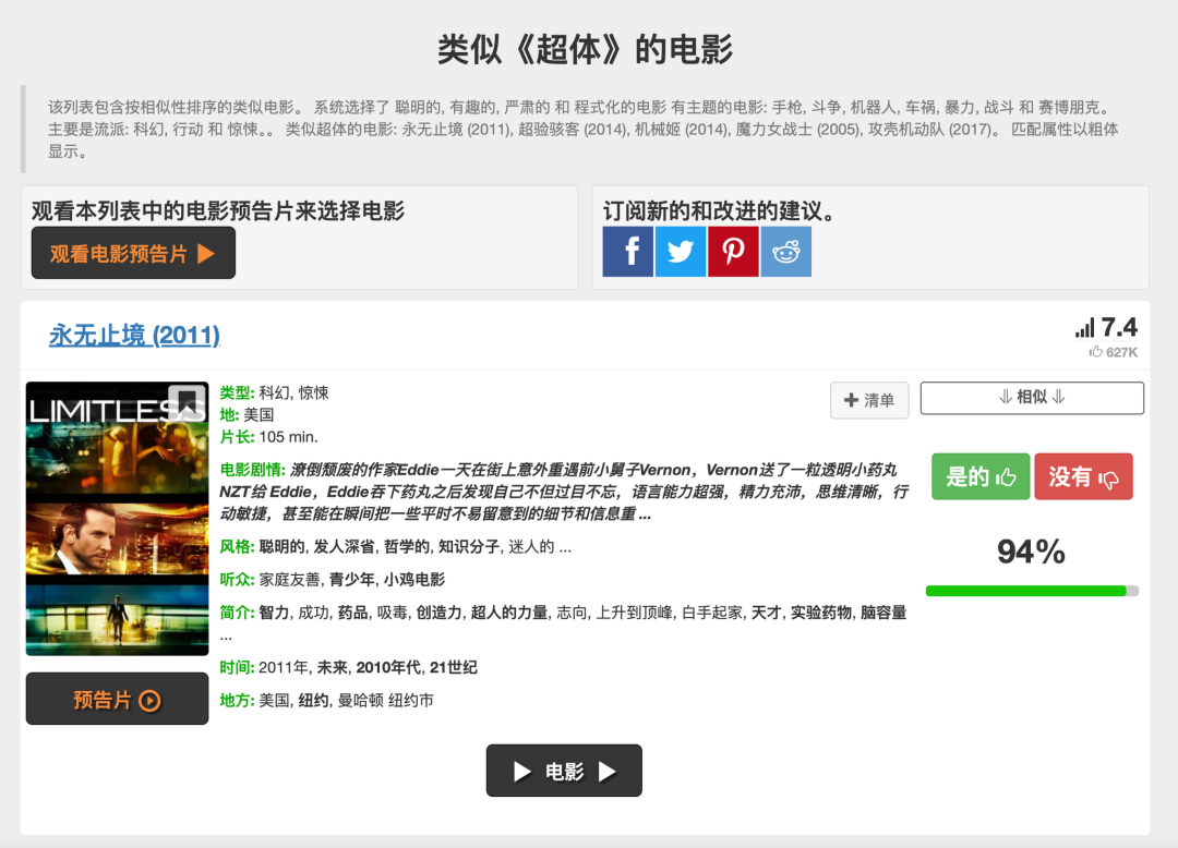 输入喜欢的电影名称,网站就能帮我们列出类似电影的列表。并且会显示风格、简介、关键词等,帮助我们筛选。绝对是影视爱好者的必备网站。