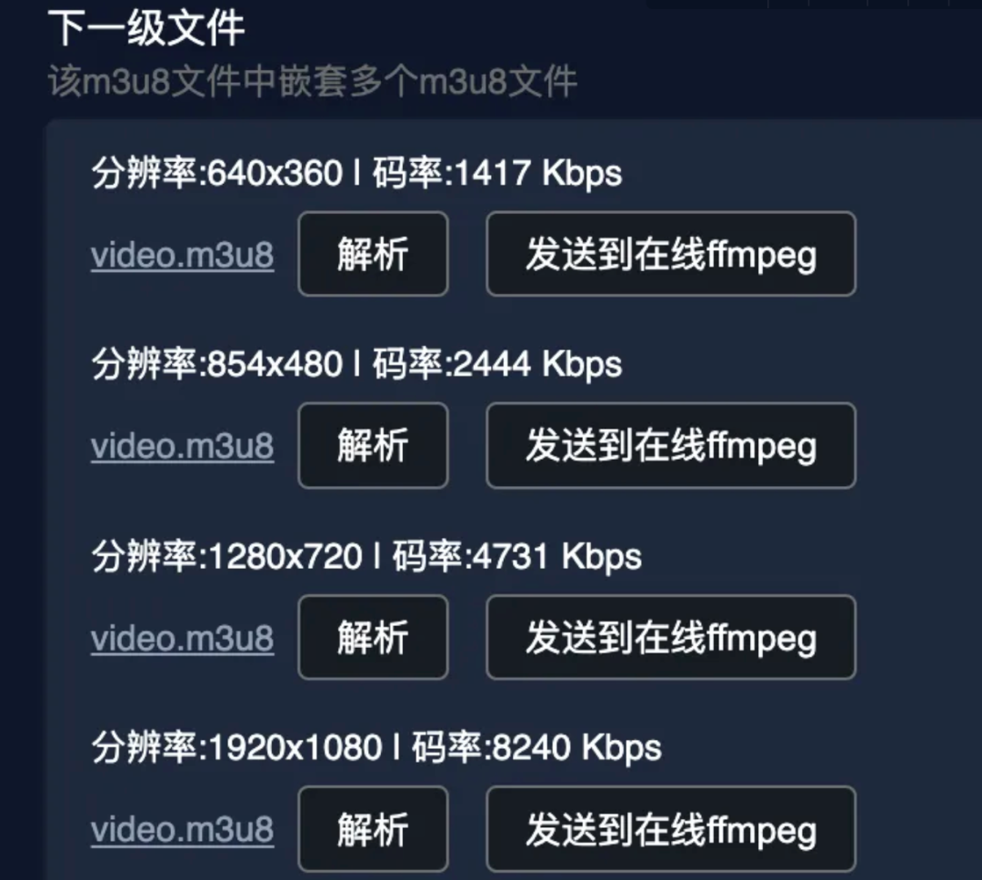 如果是在线流媒体视频的话,只需要点击第二个搜索按钮,然后点击发送到在线 ffmpeg。