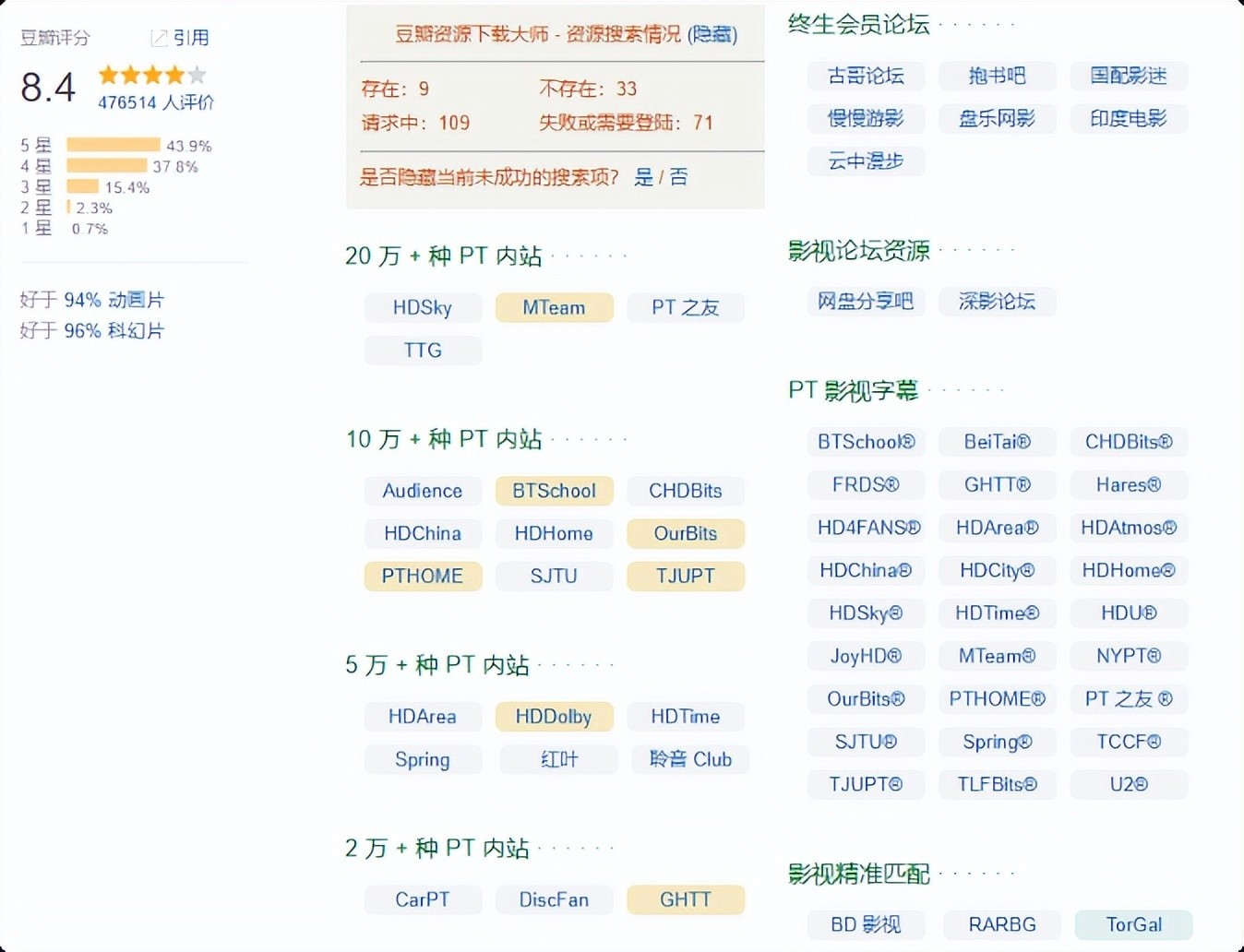 不仅仅是影视资源,几乎所有豆瓣条目都可以,例如电视剧、纪录片、综艺、动画、音乐、图书等等,都会帮你找资源。