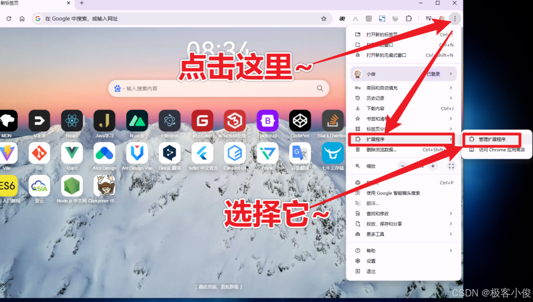 首先我们打开Chrome浏览器,然后点击右上角自定义控制按钮,选择扩展程序–>管理扩展程序