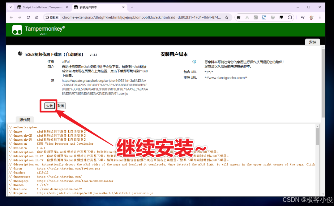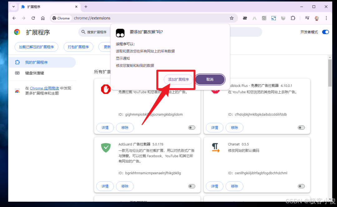 这里会马上弹出一个对话框询问我们是否要添加这个油猴插件到浏览器中!