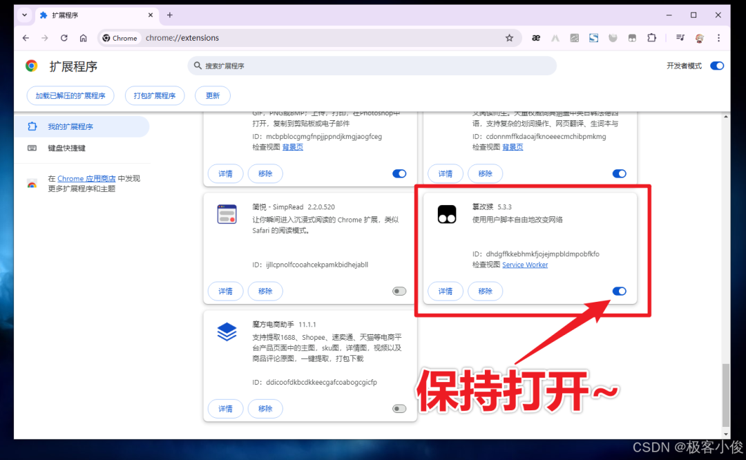 此时油猴插件也会在我们的扩展管理列表中显示出来