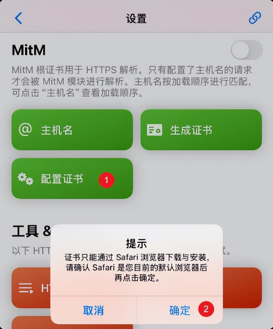 找到 MitM 的设置。MitM,全称 Man-in-the-Middle,它通过在设备上部署根证书解密和分析 HTTPS 流量。