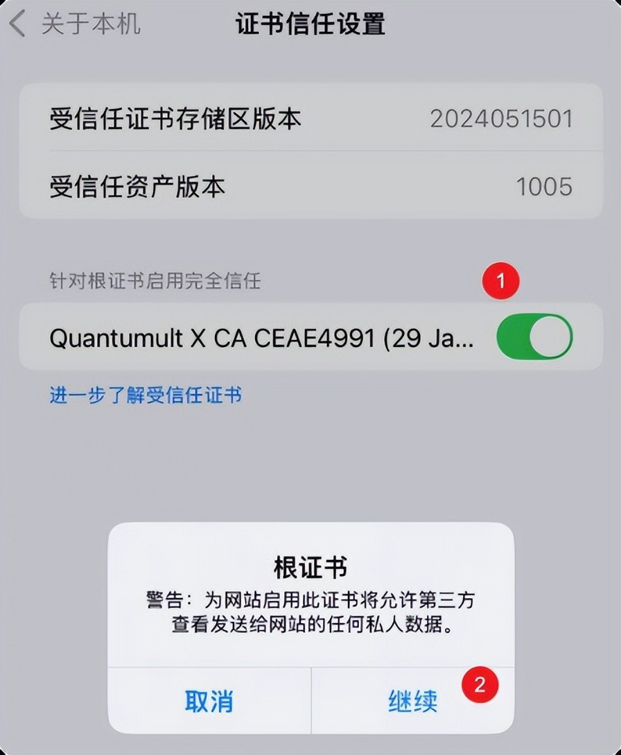 拉到最下方,找到「证书信任设置」并点击: