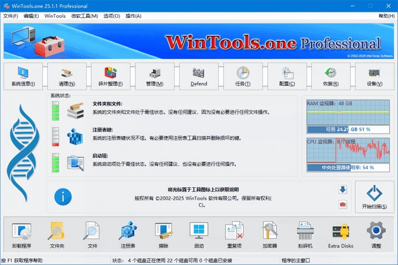 WinTools.one Pro 中文便携破解版是一款专业的系统优化工具,旨在帮助用户全面提升Windows系统的性能和稳定性。随着使用时间的增长,操作系统往往会积累大量的无效文件、注册表错误以及启动项,这些都可能导致系统变得缓慢和不稳定。WinTools.one Pro提供了一系列实用的优化功能,用户可以通过简单的操作快速清理掉不必要的文件,修复注册表问题,释放系统资源,从而显著提升电脑的运行速度和响应能力。无论是一般用户还是高级玩家,都可以通过这个工具实现高效的系统维护。
