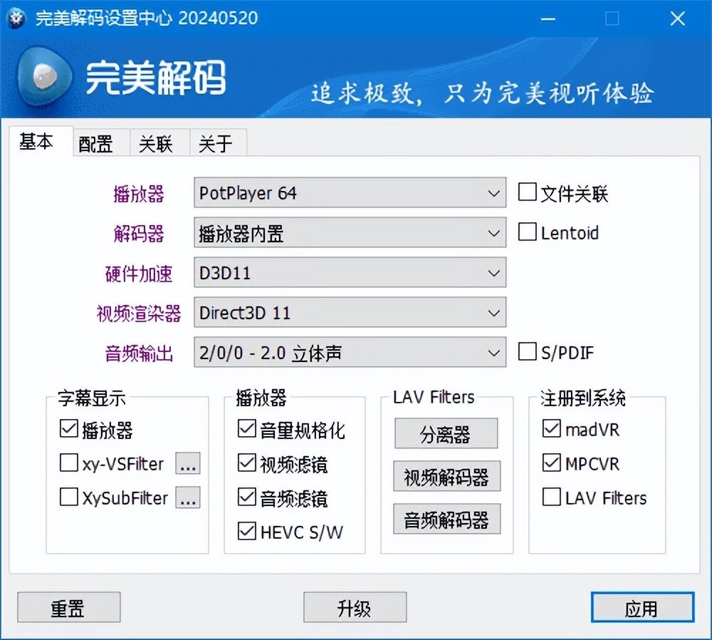 完美解码播放器是完美者为高清影视爱好者精心整合的老牌全能影音解码包,集成了多媒体播放器PotPlayer,MPC-BE,分离器解码器套件LAV Filters,高画质渲染器MADVR,能够软硬编解码所有音视频,支持中英语言.