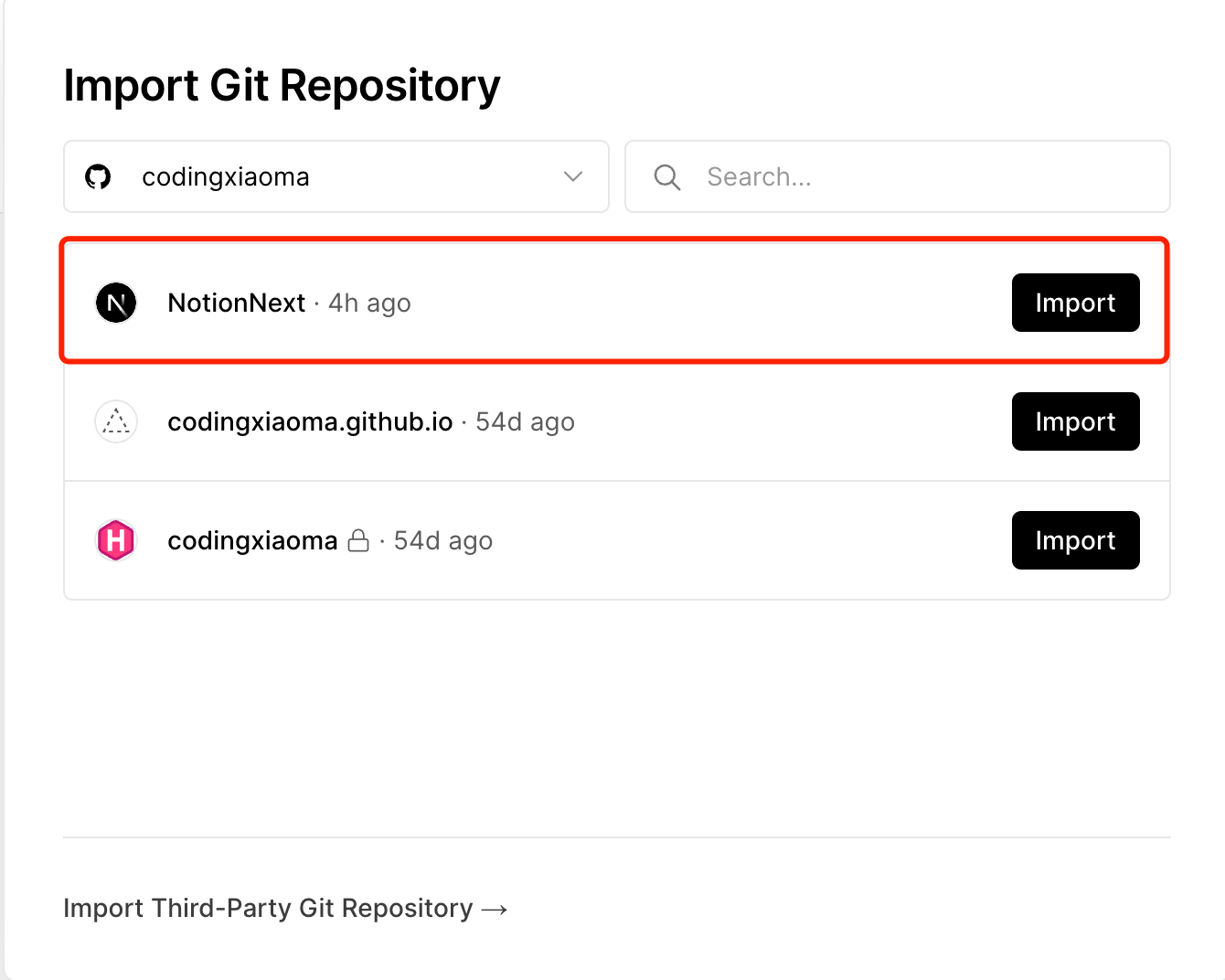 导入Git仓库,可以选择导入所有仓库,也可以选择导入指定仓库NotionNext