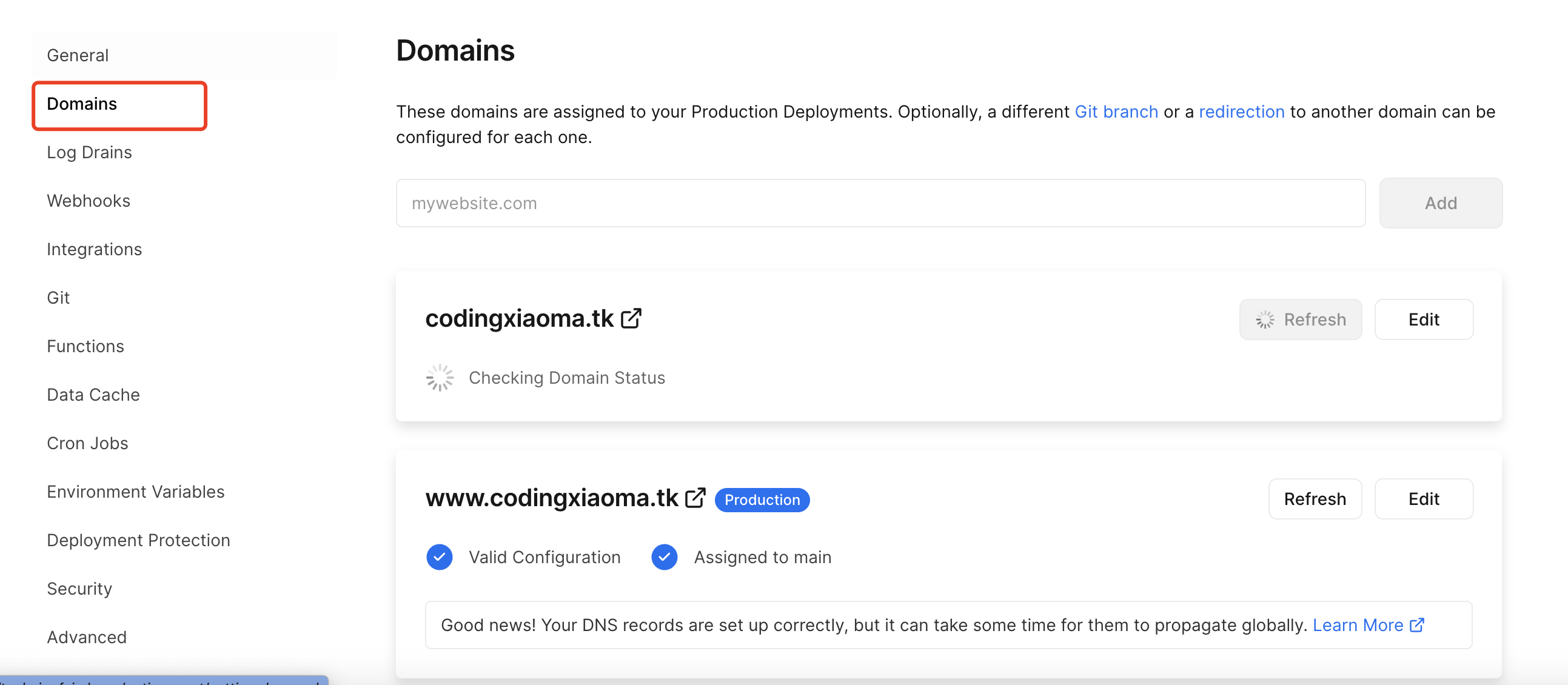 有了域名之后就是域名配置,我们直接在setting里面找到domain然后配置域名,填写你白嫖或者购买的域名,配置后会要求你在域名解析商里面填两条记录。