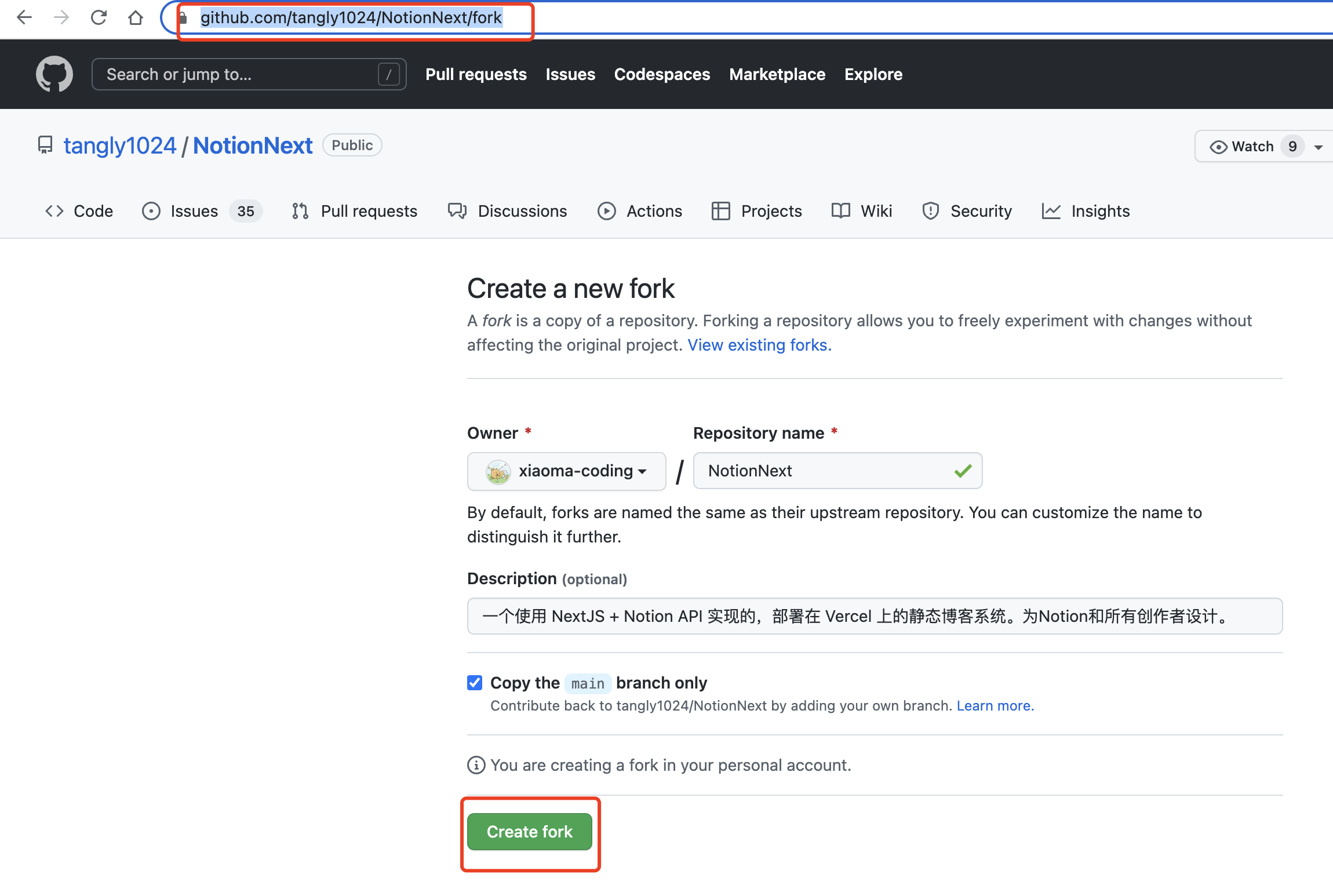 Fork后就会弹出如下界面,点击Create Fork,就会在你的Github账号里面拷贝一份代码。