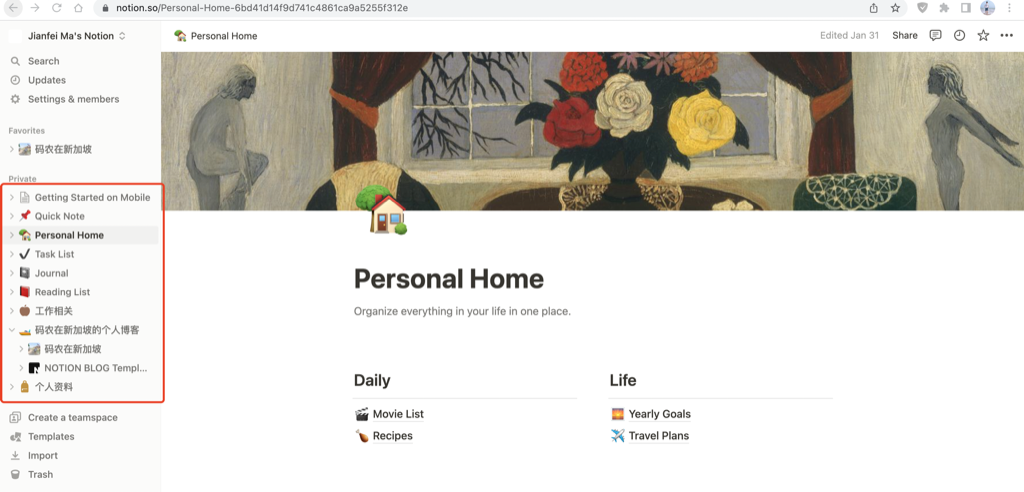 所以说Notion是非常强大的。当你需要写一篇文章的时候,只需要在复制后的模版里面添加一行,然后编辑那个页面就可以了。编辑完之后,链接可以分享给其他用户,他们可以通过链接访问我们的个人主页。这也是Notion的协作工作所支持的,可以支持页面分享。