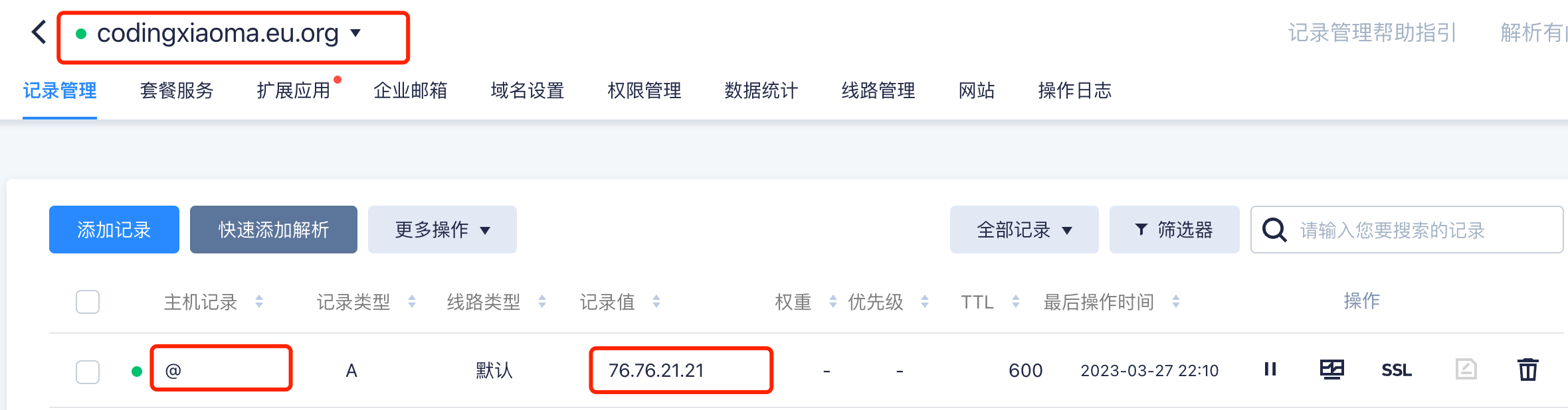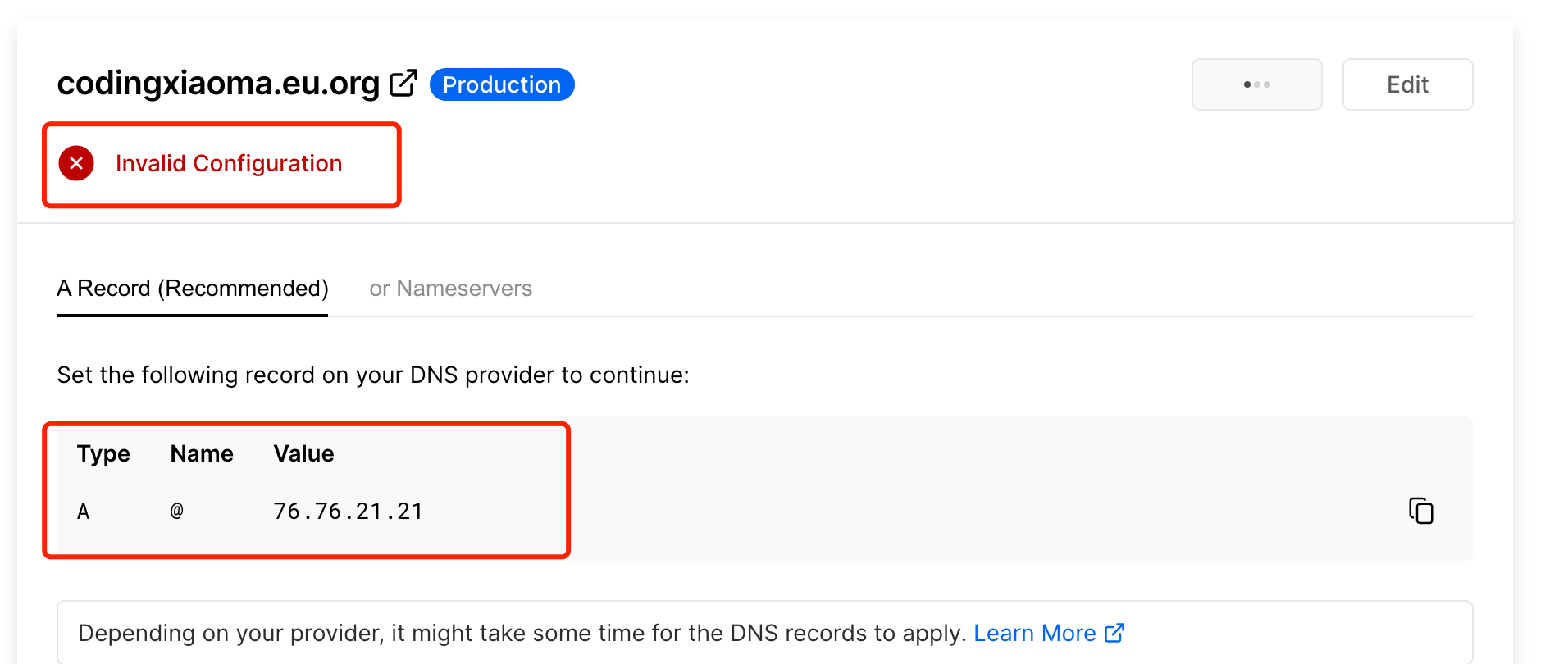 回道DNSPod域名解析商那里添加一条A记录,记录值就是Vercel平台提示的IP地址。