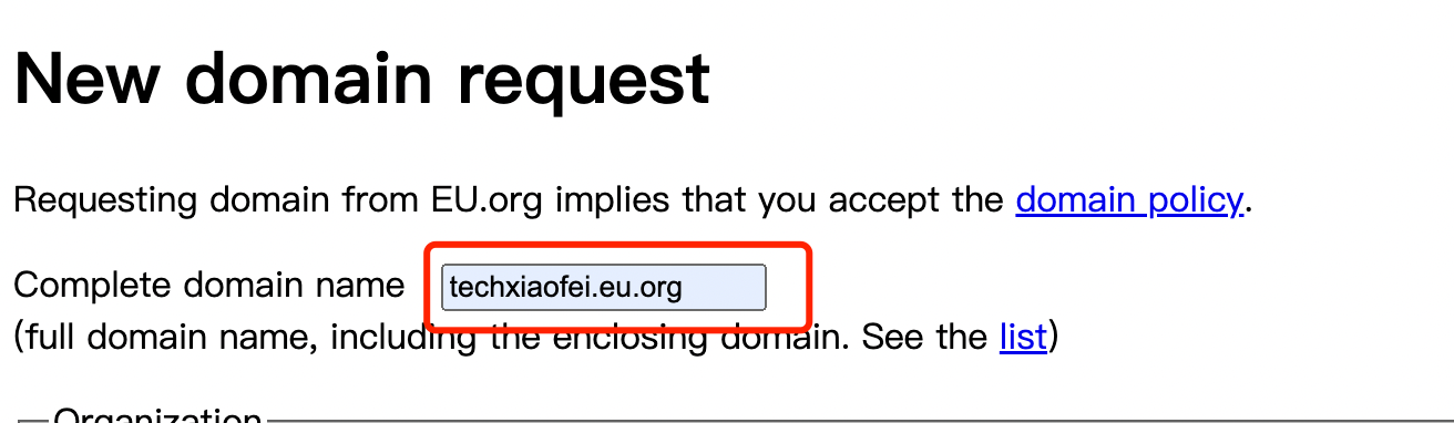 设置你的域名,eu.org后缀,比如我申请一个新的域名:techxiaofei.eu.org
