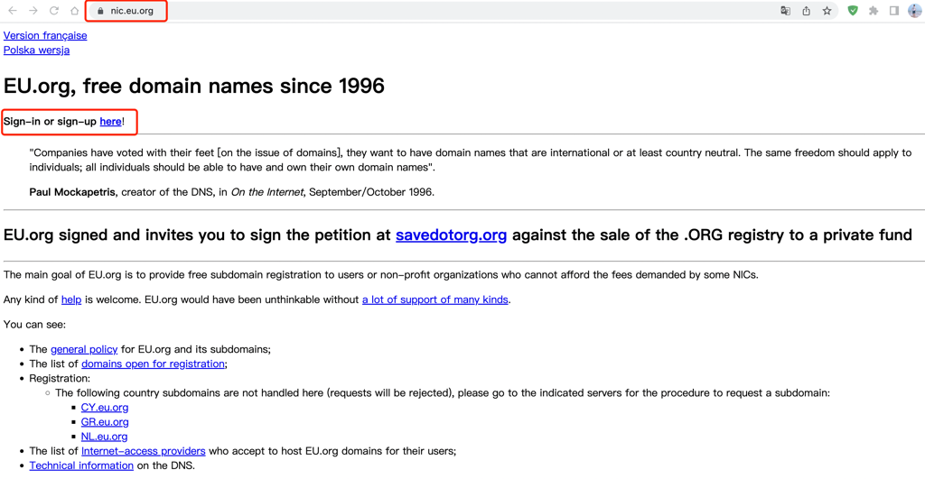 eu.org一个从1996开始提供免费域名的组织, 其官网地址是 https://nic.eu.org/ ,他帮助学生、爱好者或者非营利组织不用花费购买域名就可能拥有自己的免费域名,虽然 eu.org 网域切确来说这是一个子域名(Subdomain)或者二级域名,但是根据一些网站的资讯,有许多大型互联网公司,像是 Google, Cloudflare, Bing 等厂商都已经将eu.org域名当成是一个顶级网域了。