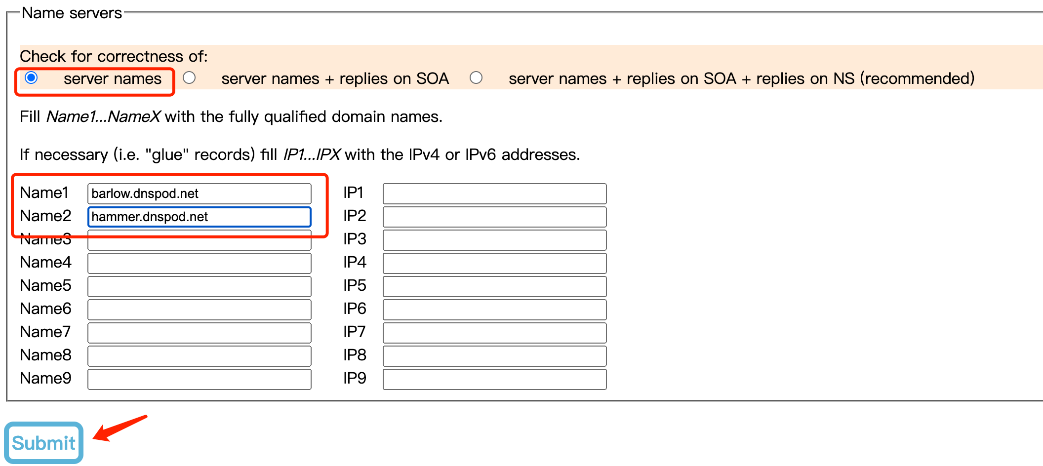 选择server names,然后填写刚才DNSPod上的两个DNS服务器地址: