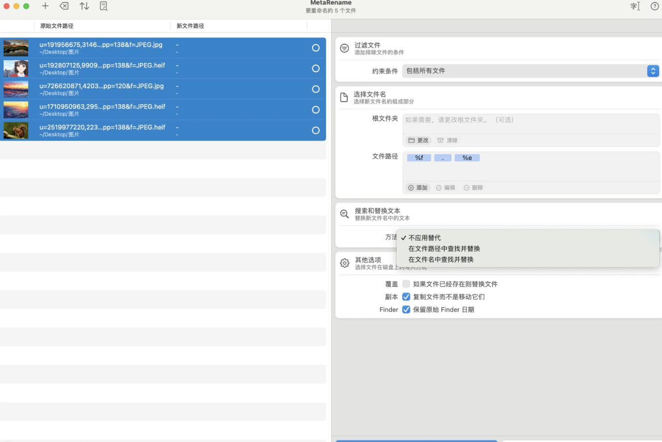 MetaRename for Mac是一款功能强大的文件批量重命名工具。它可以帮助Mac用户快速、方便地批量重命名文件,提高工作效率。MetaRename支持对文件名称、扩展名、创建日期和修改日期等元数据进行修改。使用MetaRename,您可以根据自己的需求,灵活地设置重命名规则。例如,您可以使用文件的创建日期作为新的文件名,或者在文件名中添加特定的前缀或后缀。此外,MetaRename还支持使用自定义的文本、数字序列和日期格式等作为重命名规则的一部分。