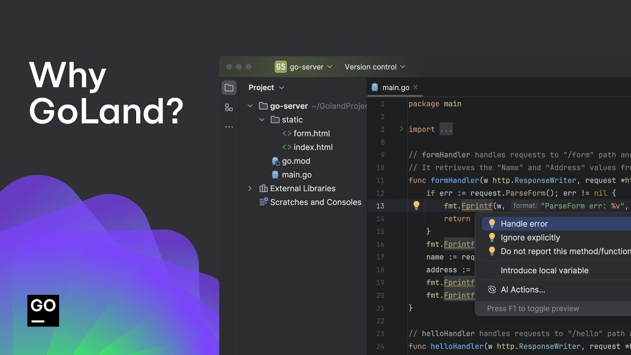 即时的错误检测和修复建议、快速安全的重构、一步撤销、智能代码完成、死代码检测和文档提示帮助所有Go开发人员(从新手到经验丰富的专业人员)创建快速、高效和可靠的代码。